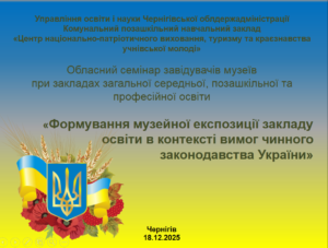 18 грудня 2025 року комунальним позашкільним навчальним закладом «Центр національно-патріотичного виховання, туризму та краєзнавства учнівської молоді» в режимі онлайн проведено обласний семінар завідувачів музеїв при закладах загальної середньої, позашкільної та ...
